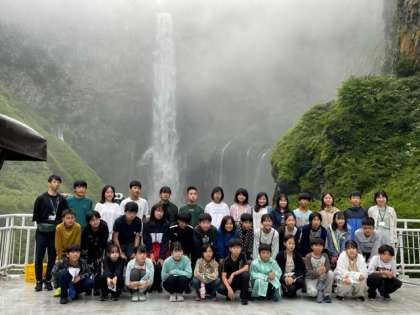 華厳の滝に向かう道中、雷が鳴り始めました。まもなく到着するという頃にどしゃ降りの雨。到着後10分ほどバスの中で待機していると、雨が止みはじました。あたりは霧です。華厳の滝が見えるかなと思いながら100メートル下がりました。荘厳な滝が目の前に。みんな感動していました。毎秒1.5トンの水量、しぶきがたくさん上がり、勢いのよさを感じます。標高は1260メートルの地点になります。