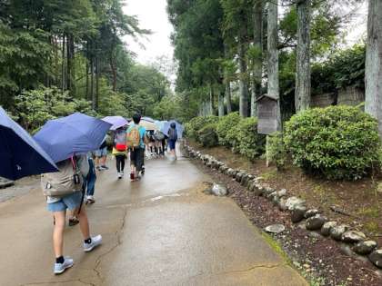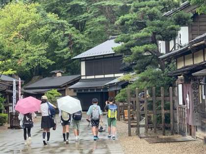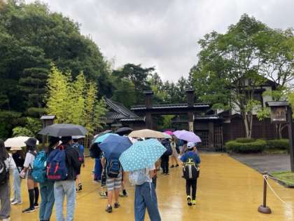 日光江戸村に到着しました。雨が降っています。でも、この後、子どもたちは傘をささずに楽しむことができました。雨が上がった直後の江戸村も風情があります。現在の気温は26℃です。