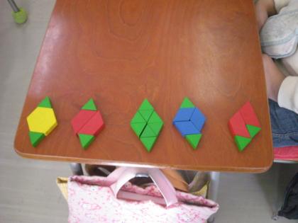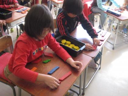 算数の授業でした。パターンブロックといって、色のついたいろいろな形の積み木を使って算数の四角形の授業をしていました。同じ四角形を作るのでも、ブロックの並べ方はいろあります。いろんな並べ方で四角形を作りながら、図形を作る楽しさを感じています。よく考えて作っている4組の子どもたちでした。
