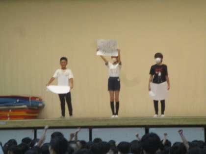 集会委員による集会が行われました。今日の集会は「先生のことをもっと知って仲良くなろう集会」で、先生に関するクイズを出しました。先生が小学生のころによく遊んでいた遊びを3拓クイズにして出題、大盛り上がりの集会となりました。