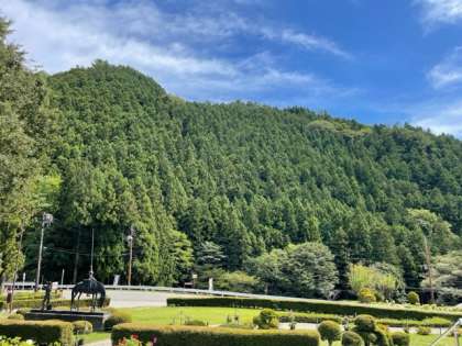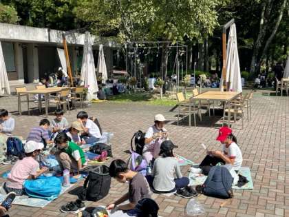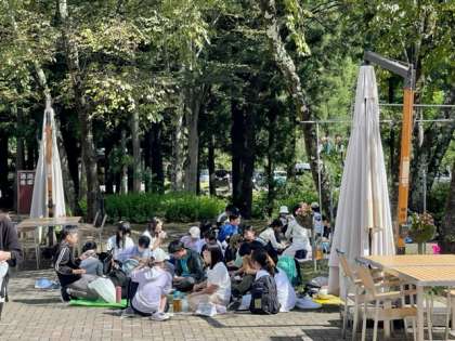 ビレジでお弁当をおいしくいただきました。見渡すと、緑の自然でいっぱいです。