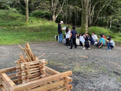 カレーを食べた後はキャンプファイヤーです。これまでキャンプファイヤー実行委員の子どもたちが準備を重ねてきました。今日もみんなが集まる前から打ち合わせをしてキャンプファイヤーの成功のために努力しました。火の使徒も準備万端です。
