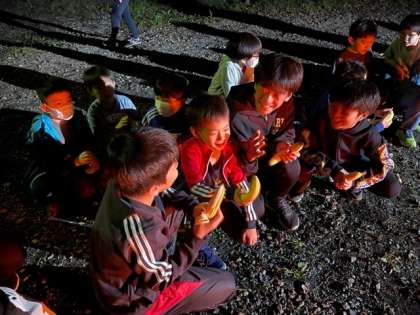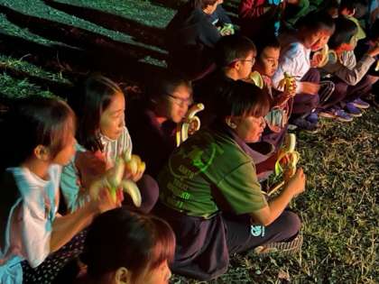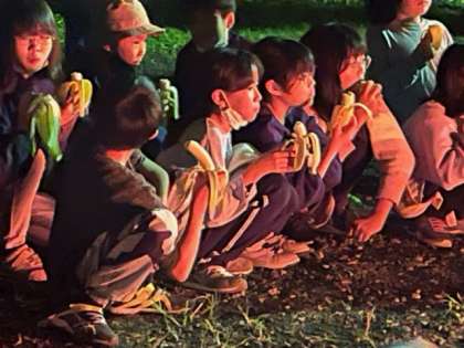 小さくなっていく日を見ながら、バナナを食べました。火を見つめる目は真剣です。