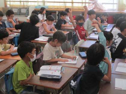3年生の外国語活動では「色、果物、スポーツ」など好きなものを尋ね合いました。3年生の外国語活動は 担任とALTによるチームティーチング(TT)で行っています。