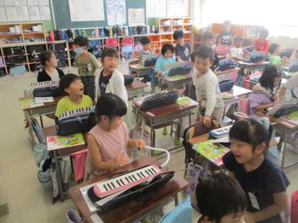 1年生の音楽の様子です。今日は鍵盤ハーモニカで、ドレミの練習をしました。2学期になり、できることが増えてきた1年生。友達と見合ったり、教え合ったりして学習しました。