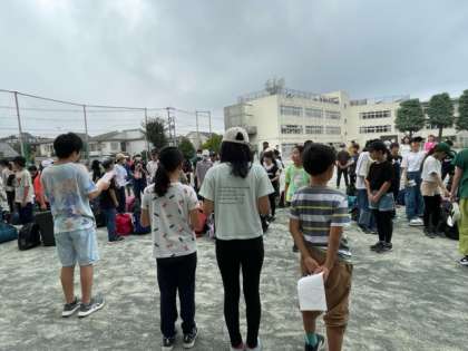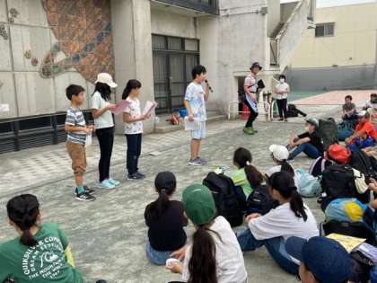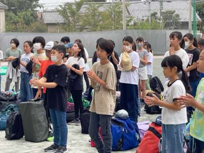 4組・5組の川場移動教室。待ちに待った初めての宿泊行事です。学校で出発式を行いました。子どもたちの進行です。拍手で互いのがんばりを認め合う子どもたち、すてきです。