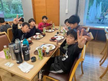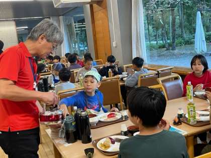 川場村で有名なリンゴと飲むヨーグルトが朝ご飯にでました。みずみずしいリンゴ、とっても人気のある飲むヨーグルト、おいしくいただきました。先生たちが子どもたちの水筒にお茶を補給しました。