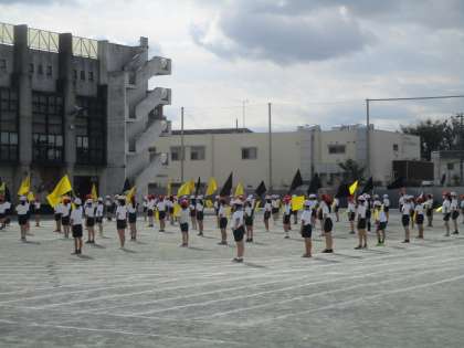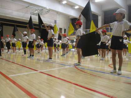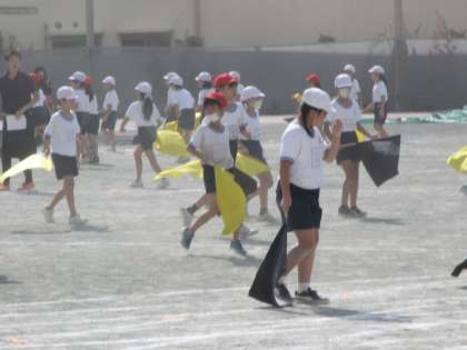 4年生の運動会表現「YAMATO魂!」の様子です。金と黒のフラッグが青空に映えます。体育館では動き・ポイントの確認。校庭では踊りに加え、立ち位置の確認しています。子どもたちの頑張り、一生懸命さに感動しています。