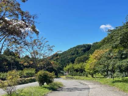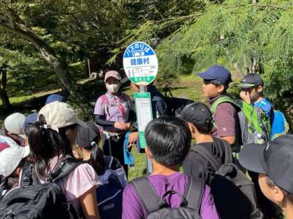川場村のバスの運行数が少ないことに気が付きました。交通手段の多くは自家用車ということも教えていただきました。川場村は果物の種類も豊富だそうです。クリや柿も見つけました。緑いっぱいの中、2時間30分程度、歩きます。