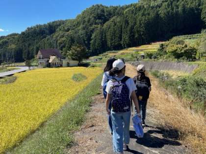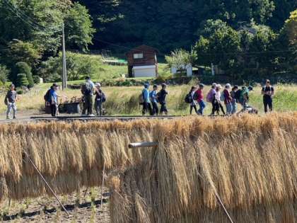 川場村では稲刈りのシーズンを迎えています。川場の棚田(田んぼ)や里山風景を興味深く見学しました。稲刈りが終わった田んぼも見ました。天日干しをしている農家が多いことも教えていただきました。