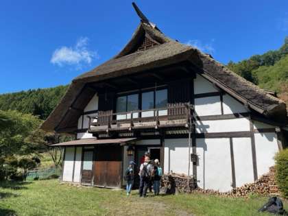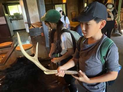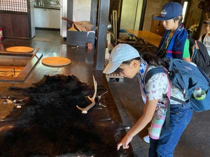 途中にある古民家を見学しました。クマの毛皮や鹿の角に興味いっぱいです。
