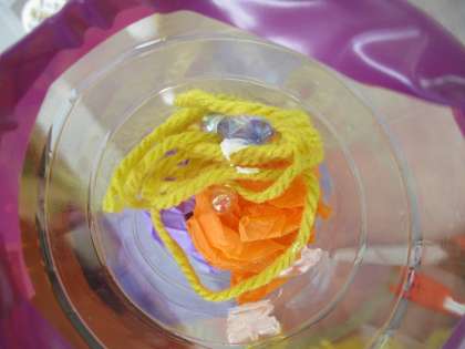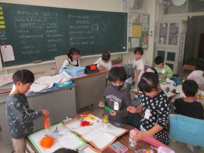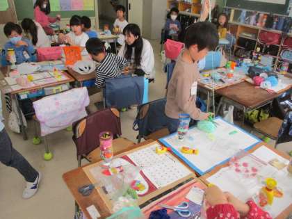 1年生の図工の様子です。どんなパフェを作りたいのか、考えて工夫して作りました。