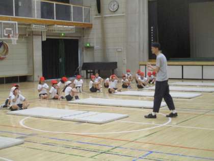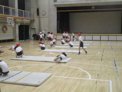 5年生のマット運動の様子です。今日は前転、後転などの基本的な技を練習しました。マット運動はただ回転するだけでなく、手で身体を支持したり、体を丸めたりする全身運動です。マット運動の学習経験が跳び箱運動に生かされます。