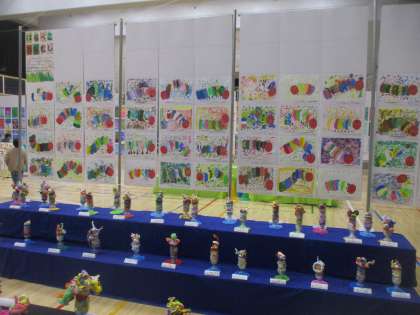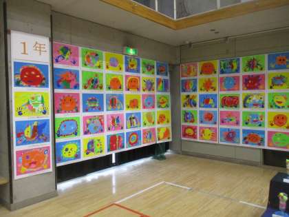 1年生は「はらぺこあおむし」「手のひらに太陽を」「あったらいいな こんなパフェ」を展示しています。