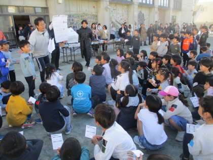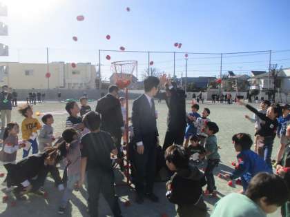 今日はおやじの会の皆さんによる「塚戸逃走中」が行われました。いわゆる鬼ごっこです。黒服、サングラスをしたおやじたちがハンターとなり、子どもたちを捕まえます。子どもたちは、ハンターに捕まらないように逃げます。途中ゲームもあり、大人も子供たちも楽しみました。朝早くからこの日のために準備していただきました。ありがとうございました。