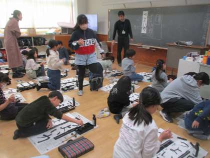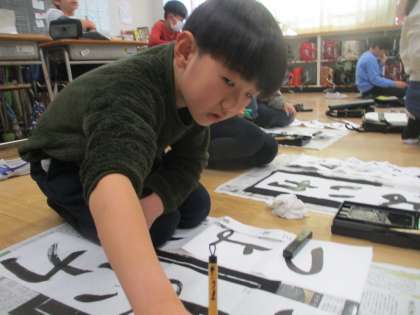 3年生の書初め練習の様子です。3年生は「つよい力」を書きます。毛筆は3年生から学習が始まったので、書初めとなると文字のバランスなど、難しかもしれません。しかし、一生懸命に取り組んでいました。すごい3年生。