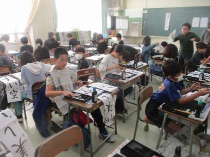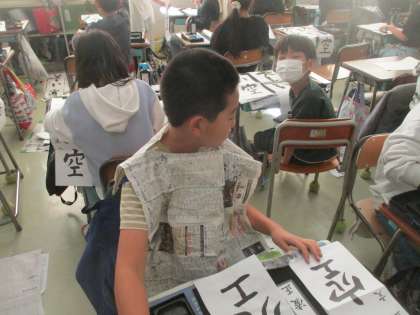 4年生の書初め練習の様子です。「美しい空」を書きます。長い用紙を使っての練習、いつも使っている半紙で一字一字練習、一人一人が考えながら練習に取り組んでいました。さすが4年生です。