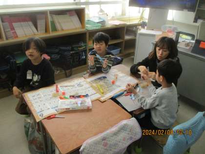 生活科の学習でビュンビュンごまを作りました。この学習で作ってこまを、保育園児にプレゼントします。幼保小連携で、来週、4月から1年生になる年長さんが塚戸小に来ます。丁寧に色塗りも行っていました。きっと、喜んでくれますよ!