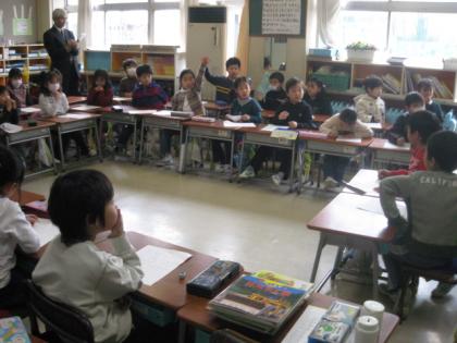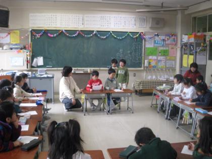 学級活動の授業でした。おたのしみ会の係を決めるのが議題でした。「先生は手伝わないよ」と柴田先生。子どもたちだけでやるにはどんな係が必要だろう。「○○係がいいと思います。どうしてかというと・・・・」「○○係に賛成です。・・・・だからです」など、子どもたちだけで議事を進めていました。進め方、意見の言い方など、1年生でこれだけできるんだと感心しました。