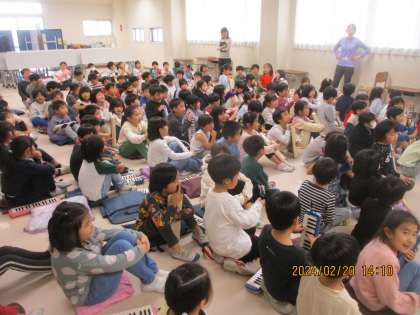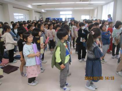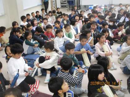 1年生の学年音楽の様子です。今日は多目的室で「6年生を送る会」の出し物の練習をしました。心を込めて「喜びの歌」を合奏も合唱も行います。