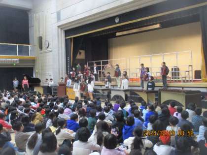 今朝の朝会は音楽クラブの発表集会がありました。4,5,6年の異学年のメンバーがクラブ活動の時間に練習したYOASOBIの「アイドル」を発表しました。全校児童の前で練習の成果を存分に発揮しました。音楽クラブの皆さん、頑張りました。