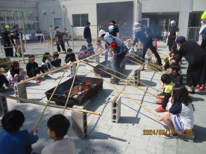 おやじの会主催の「あそぼうパン」が行われました。パン屋さんがつくったパン生地を使い、子どもたちは竹の棒にまかれたパンを一人一人焼いていきました。もちもちとした食感のパンでした。今年度も子どもたちのために、様々な企画を立てて行っていただきました。ありがとうございました。