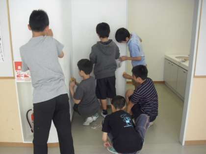 6年生男子が黙々とトイレの壁に向かい何やら作業をしています。
