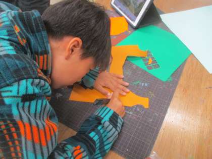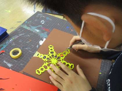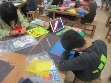 「カット、ペタッとすてきな形」では、いろいろな色紙を使って、切り方や重ね方を工夫して作品を仕上げていました。