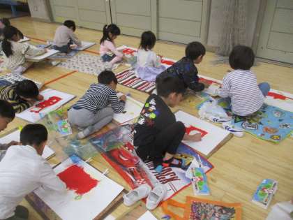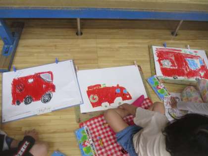 消防署から貸し出されたパネルと担任が用意した写真を使って、絵を描きました。