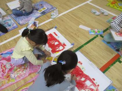 本来であれば校庭に消防自動車が入り、校庭で絵を描くはずでしたが、残念ながら雨のため、体育館で行われました。