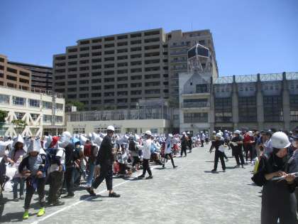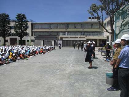 校庭に全校児童が集まり、安全に下校するため保護者の方に迎えに来ていただきました。1年生は初めてでしたが、みんな真剣に取り組みました。