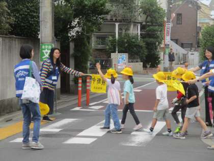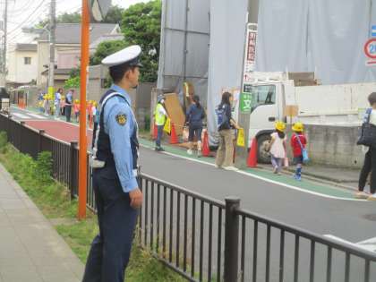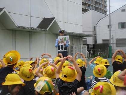 成城警察署より5名の方が訪れ、横断歩道や交差点での注意事項を話されました。