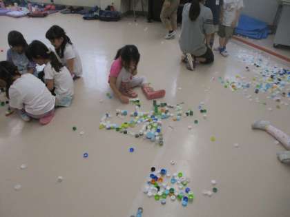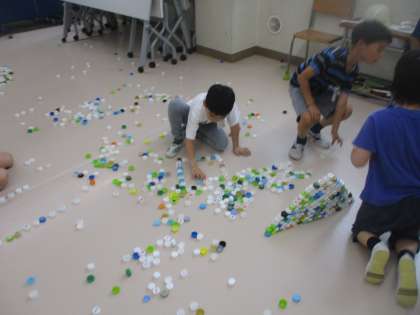 今日は、多目的室で1年生がペットボトルキャップを大量に広げていました。何かなと思い部屋に入ってみると、みんなで協力してキャップを並べたり、高く積んだりしていました。