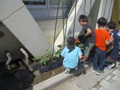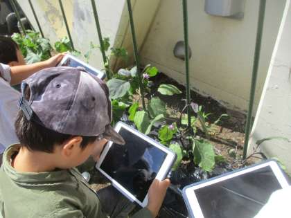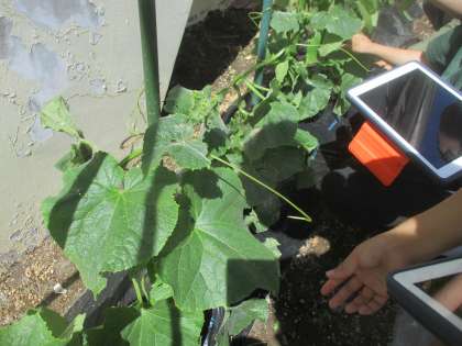 国語「かんさつ名人になろう」で、栽培している植物を観察しました。タブレットで撮影したり、植物の生長を確かめたりしていました。キュウリやナスを育てています。早く大きくなるといいですね。