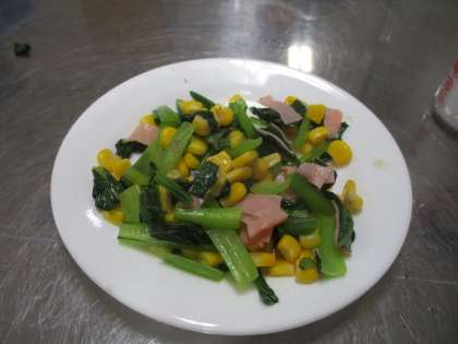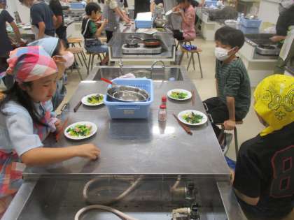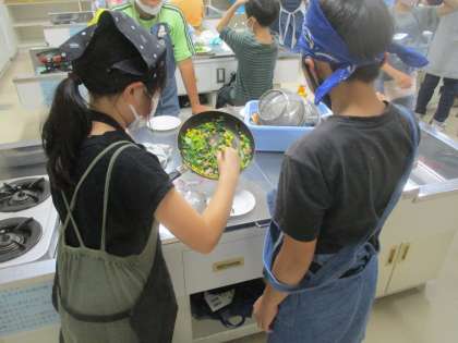 6年生が調理実習に取り組んでいました。「小松菜とベーコンとコーンの炒め物」を作りました。グループで手分けして、調理器具を用意したり、食材を切ったりして、素早く調理していました。あるグループが「先生も食べてみて。」と皿に盛りつけてくれました。