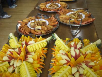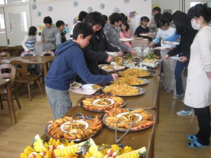 卒業を控えた6年生に、毎年この時期、「バイキング給食」を行っています。今日は、2組でした。給食調理室で、豪華に盛り付けてくれました。子どもたちは、好きな食べ物を選び、食べます。子どもたちの心は、ウキウキです。栄養士さんの話を聞いた後、早速選んで食べ始めました。