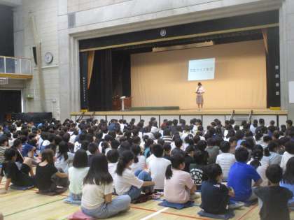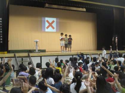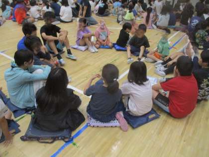 今日のゲームは「先生クイズ」でした。クイズでは、いろいろな先生の好きなものをつかどん班に分かれて考えました。体育館に班ごとに円になり6年生を中心にクイズを考えました。体育館いっぱいの子どもたちで、クイズ集会は盛り上がりました。