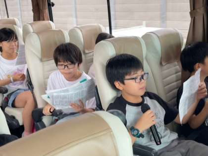 三芳パーキングを出ると、子どもたちのバスレクがはじまりました。1号車はみんなで歌を歌って仲よく楽しんでいます。最初の歌は「夢をかなえてドラえもん」、続いて「Bling-Bang-Bang-Born」「アンパンのマーチ」「ダンスホール」と続きます。気持ちをそろえて盛り上がっています。バスの中が子どもたちの歌声で楽しさあふれています。