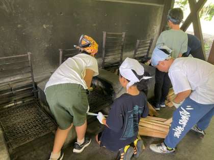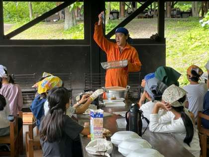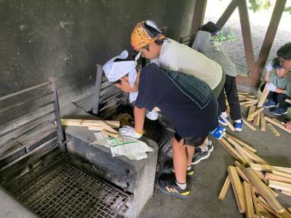 飯盒炊さんの時間になりました。補助員さんからカレーの作り方、火の起こし方など丁寧に教えていただきました。さあ、いよいよグループで協力してカレー作りです。