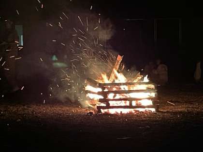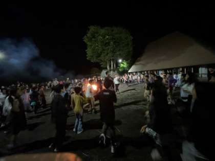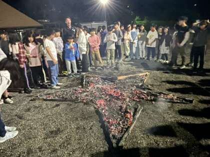 火が少しずつ消え始め、楽しかったキャンプファイヤーも終わりが近づいてきました。キャンプファイヤーが終わろうとしたとき、子どもたちの前に星があらわれました。静かに燃える火を見る子どもたち。補助員さんたちが終わる時間に合わせて子どもたちにプレゼントしてくれたのです。