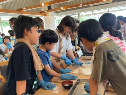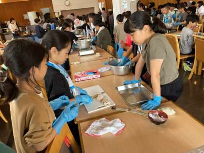 まずはこんにゃく芋を小さく切ります。みんなで順番にチームワークよく調理しています。