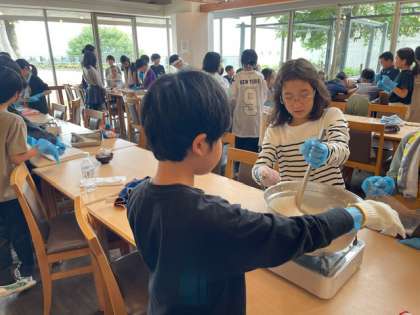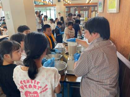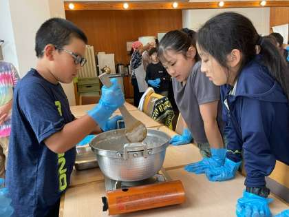 続いてミキサーでこんにゃく芋を、ビレジの方にペースト状にしていただきます。その後は自分たちでゆっくり絶え間なくかき混ぜながら火にかけていきます。