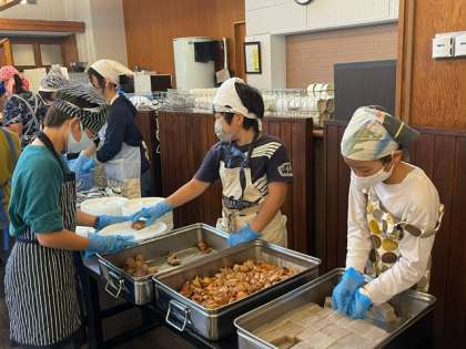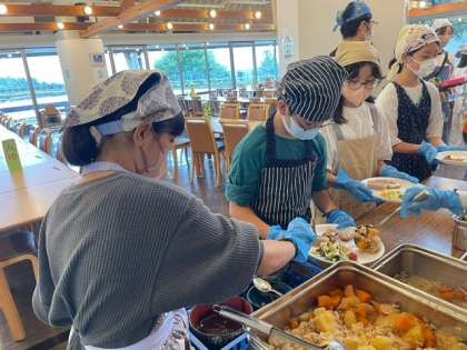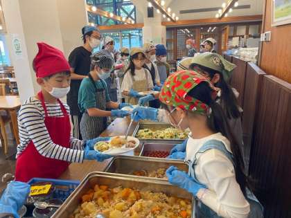 食事の準備がはじまりました。準備2回目の食事係の子どもたち。どんどん手際よくなっています。朝かかった時間を考えて少し早めの集合した係の子どもたち、がんばっています。