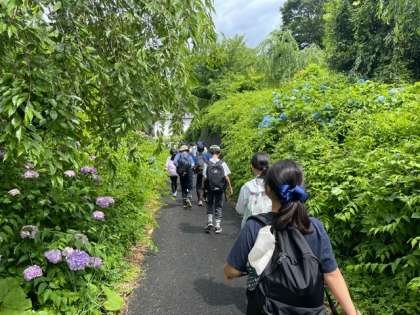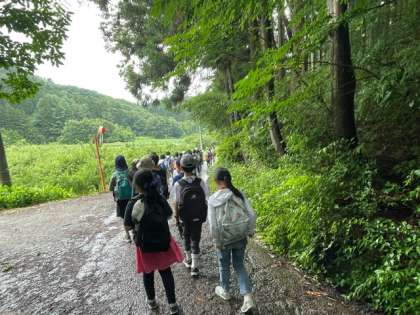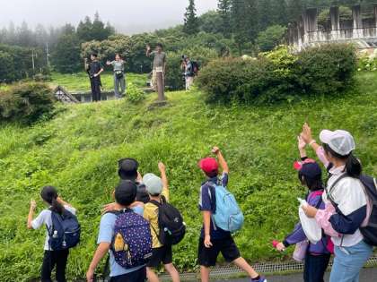 心配していた雨も上がり、予定通り9時に村めぐりに出発しました。補助員の方がお見送りをしてくださいました。実は子どもたちが出発した後、最後の部屋の確認やお弁当の準備、大きな荷物をバスに乗せるなど、子どもたちのサポートをしてくださいます。
