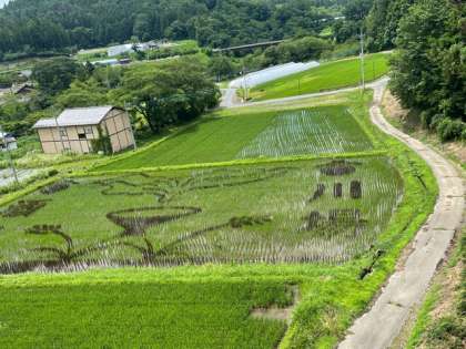 ふれあい橋を渡ると間もなく目的地の田園プラザです。つり橋の上から田んぼアートを見ることができました。この田んぼアート、秋にはどのような姿になるか楽しみです。