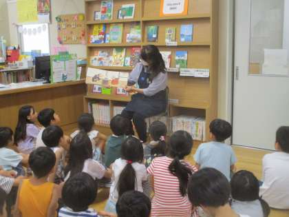 図書室では、1年生が読書をしていました。学校の図書室にも慣れ、いろいろな本を探して読んでいました。また、図書館司書の方に絵本の読み聞かせをしていただきました。