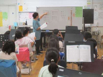 音楽では、1年生と3年生の授業を見ました。1年生は、「子犬のマーチ変奏曲」を鍵盤ハーモニカで演奏しました。みんな一生懸命に演奏しました。