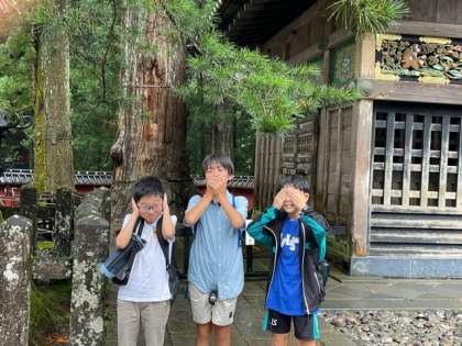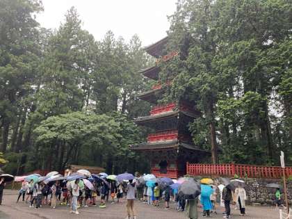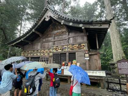 カレーをおいしくいただいているとき、雨が降り始め、次第に豪雨になってしまいました。昼食後、小降りになるのを待ってから東照宮に向かいました。日光東照宮では案内人の方が詳しくお話ししてくださいました。おかけで雨の中でしたが東照宮を満喫できました。日本の歴史と文化のすばらしさを感じました。