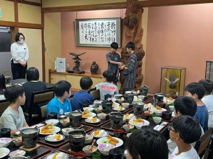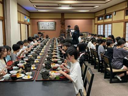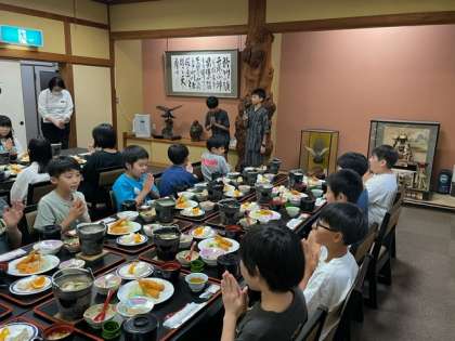 夕食の時間になりました。みんな時間を守って行動しています。5分前行動、すばらしいです。日光最初の食事に感謝の気持ちを宿舎の皆さんに伝えました。子どもたちは約束を守って、日光の食事を味わいました。おかわりした子もたくさんいました。