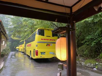 15時40分、ほぼ予定通りに宿舎に着きました。バスが着くと雨が激しく降り出しました。これまでの行程は全て予定通りに実施できています。この激しい雨次第でキャンプファイヤーの実施を決めたいと思っています。雨がやみますように。